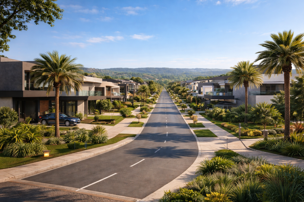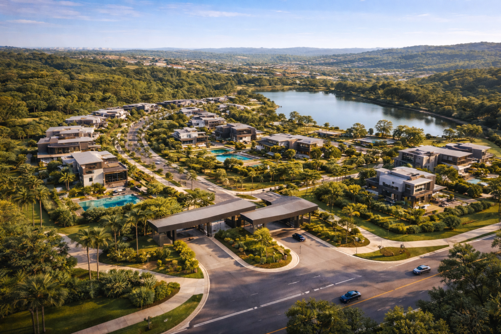 Esse tipo de empreendimento segue a lógica dos bairros planejados: ruas amplas, paisagismo integrado e normas construtivas que garantem harmonia visual entre as casas.